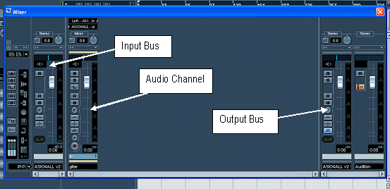 - Bila kita amati, di dalam mixer tersebut ada tiga bagian, yaitu Input Bus, Mono Audio Channel (karena tadi kita memilih audio mono), dan Output Bus, yang tergabung dalam Audition Bus.