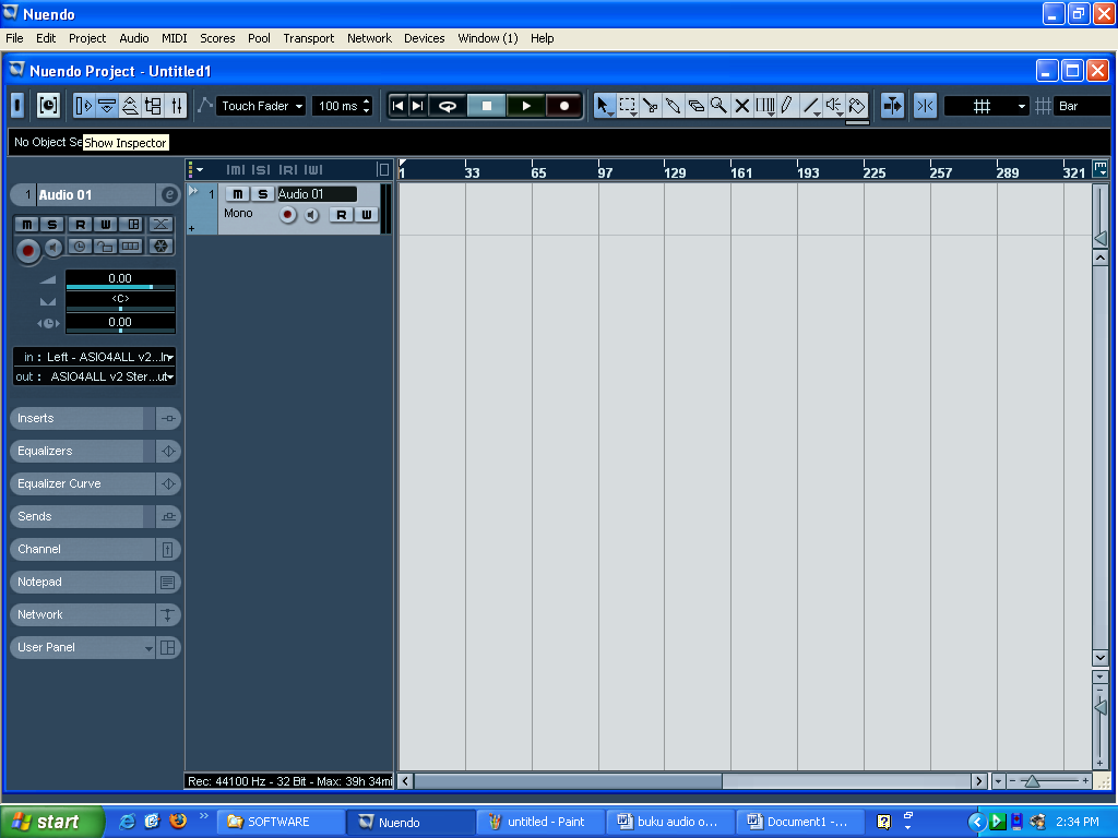 Sekarang kita telah mempunyai sebuah track audio mono, seperti gambar 29 diatas. Sebelah kiri merupakan panel inspector, dimana nantinya kita bisa menambahkan berbagai macam efek atau mengganti nama audio kita. Apabila tidak muncul kolom inspector tersebut, maka kita klik tombol Show Inspector seperti gambar 29 diatas.