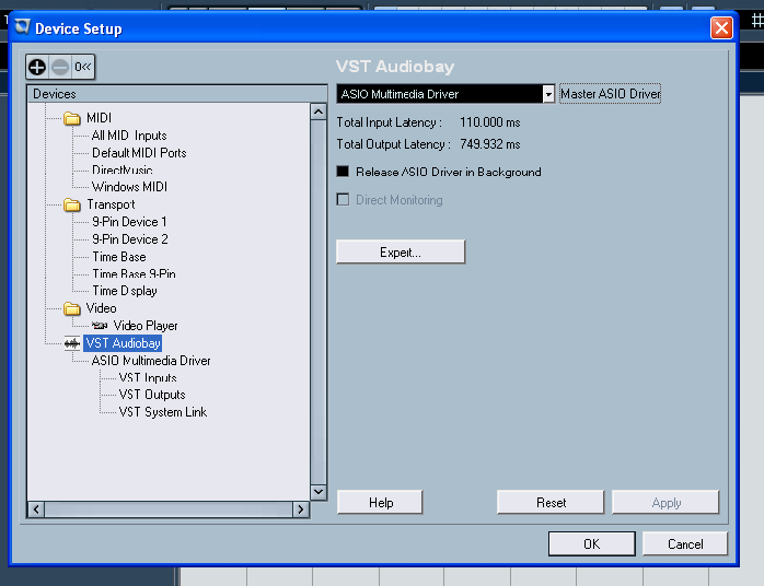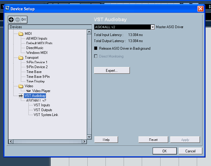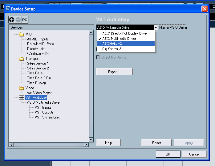 Setelah kita menginstalnya, kita buka lagi menu Device Setup, dan kita klik menu VST Audiobay di kolom Device, kemudian kita klik pilihan di menu Master ASIO Driver. Kemudian kita pilih ASIO4ALL.