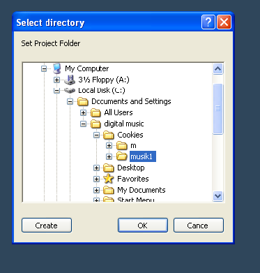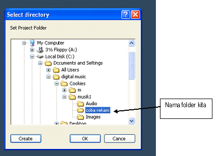 Setelah kita pilih create, muncul halaman untuk memberi nama folder kerja kita. Ketiklah nama sesuai dengan keinginan kita. Setelah itu klik OK. Kemudian muncul lagi halaman seperti gambar 11, tetapi nama folder kita telah terpampang. Ketik OK, dan kita sudah mulai masuk ke halaman kerja nuendo.