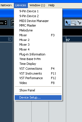 Dari sini kita telah mengetahui tombol-tombol yang akan sering kita gunakan pada saat recording dan memainkan file lagu. Apabila kita dalam proses recording ini tidak menggunakan converter atau soundcard external, melainkan dari instrument langsung masuk ke line in komputer, maka ada baiknya kalau kita buka dulu menu Device, kemudian kita pilih menu Device Setup.