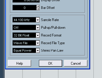 Setelah kita klik, kita lihat menunya. Pada bagian Sample Rate kita pilih 44.100 kHz, dan pada bagian Record Format kita pilih 32 Bit float. Hal ini seperti yang telah bahas dimuka, agar hasil rekaman kita nanti sesuai dengan standar sampling audio CD dan dengan memilih 32-bit, kita akan memiliki keakuratan dan dinamika amplitude sinyal yang luas. Setelah itu klik OK.