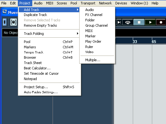 Pada menu Project dapat kita lihat banyak menu-menu tambahan. Yang terpenting adalah menu Add Track. Bila kita sorot menu Add Track tesebut, akan muncul menu-menu baru, diantaranya adalah :
